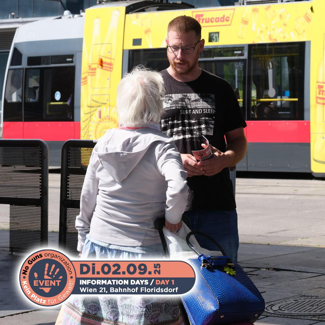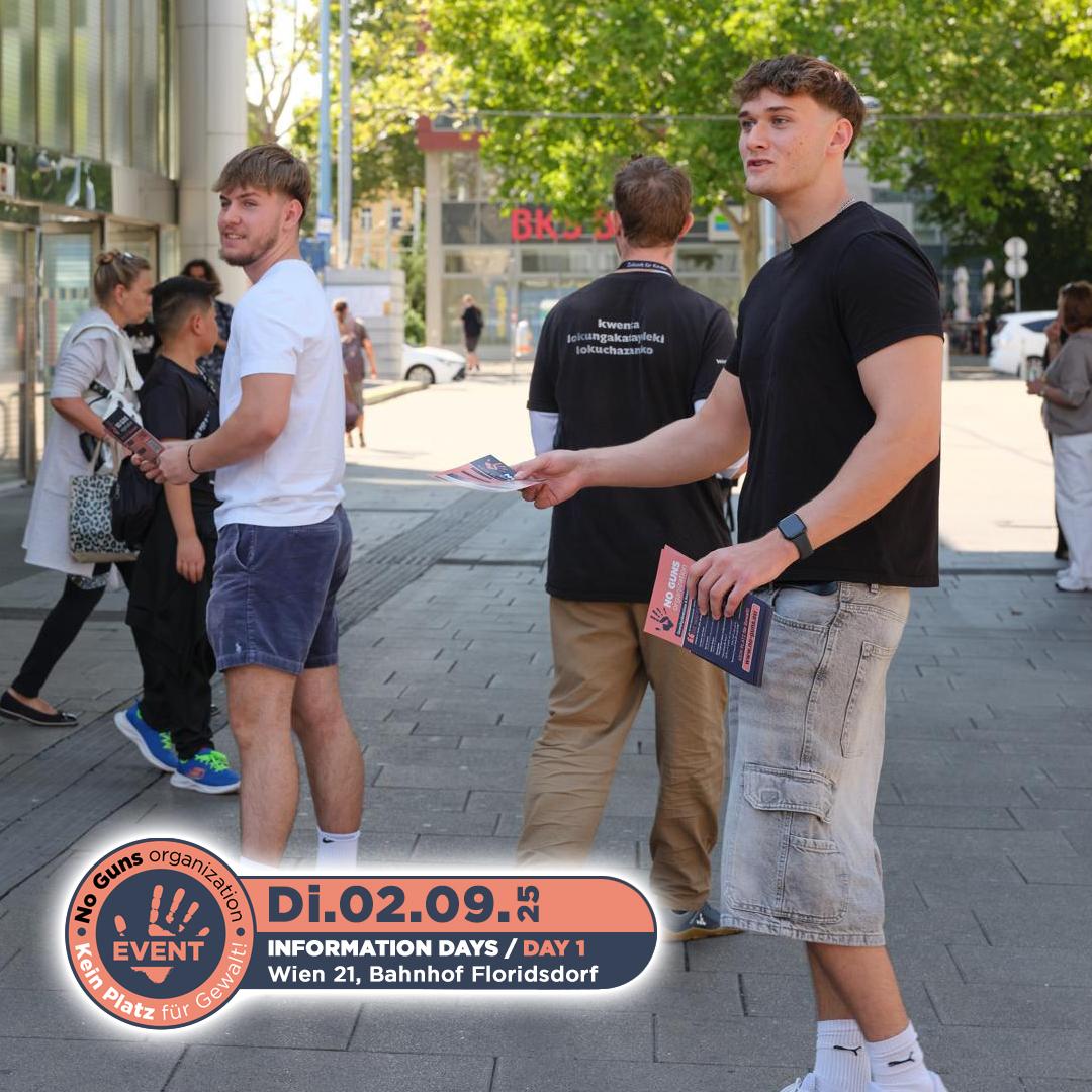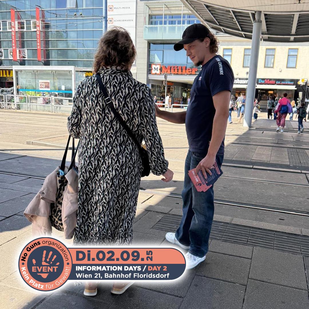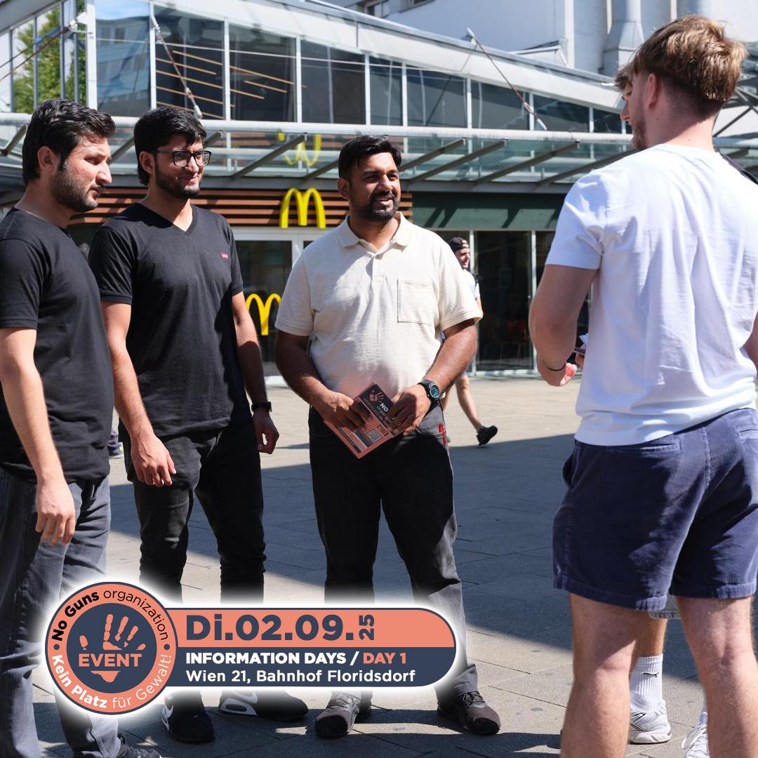 Am 2. September 2025 fand der erste Informationstag der no guns organization statt. Engagierte Freiwillige waren am Bahnhof Floridsdorf im 21. Bezirk von Wien unterwegs. Mit Flyern und persönlichen Gesprächen machten sie Passantinnen und Passanten auf unsere Organisation aufmerksam und informierten über unsere wichtige Arbeit.